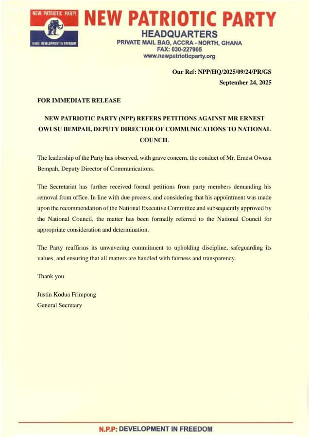The New Patriotic Party (NPP) has dragged its Deputy Director of Communications, Ernest Owusu Bempah, to the National Council following multiple petitions for his removal.