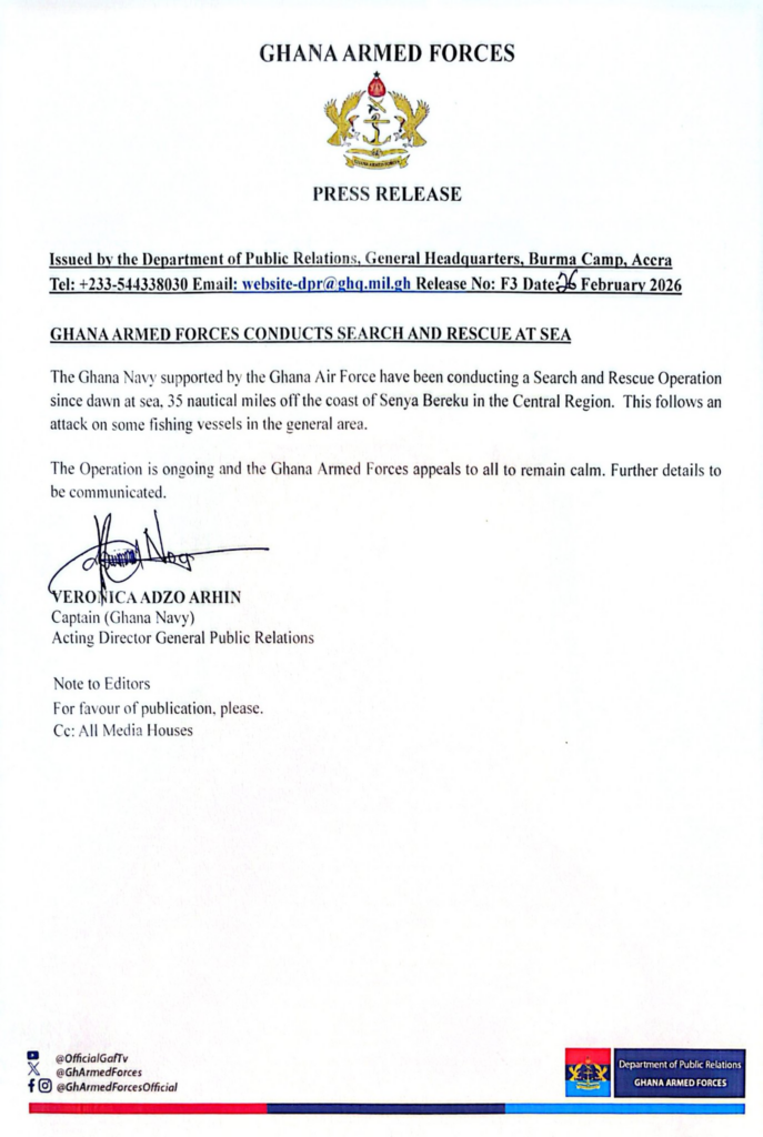 Also, the Ghana Armed Forces, in a statement issued on Thursday, February 26, has announced they have launched a search operation at dawn off the coast of Senya Breku.
