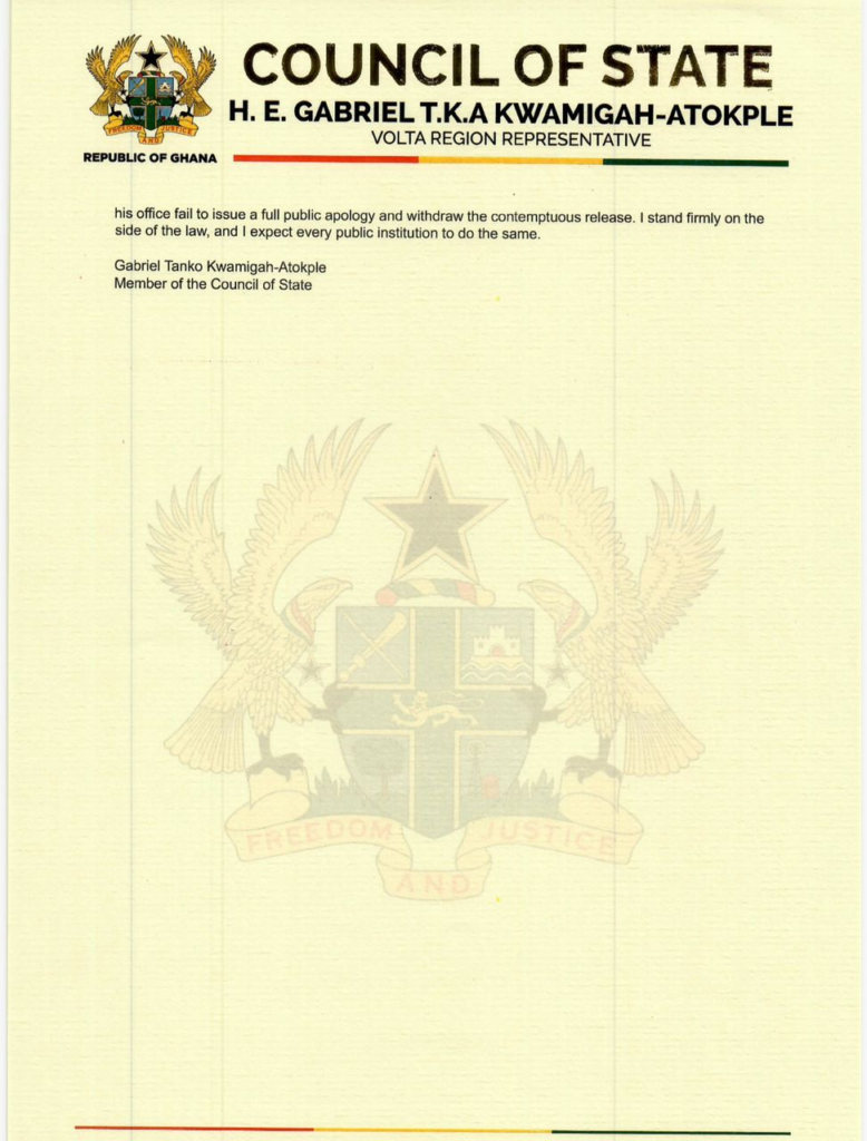 Gabriel T.K.A Kwamigah-Atokple, a Volta Regional representative on the Council of State, has issued a statement demanding that the Economic and Organised Crime Office (EOCO) and its Acting Executive Director, Raymond Archer, issue an immediate public apology or face legal action.