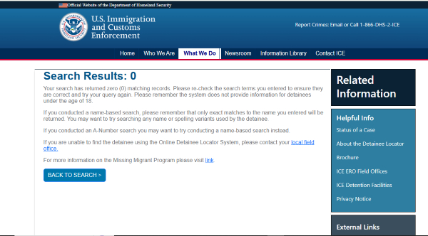 The search result on ICE website read, “Your search has returned zero (0) matching records. Please re-check the search terms you entered to ensure they are correct and try your query again. Please remember that the system does not provide information for detainees under the age of 18. If you conducted a name-based search, only exact matches will be returned. You may want to try any name or spelling variants used by the detainee. If you are unable to find the detainee using the Online Detainee Locator System, please contact your local field office. For more information on the Missing Migrant Program, please visit [link].”