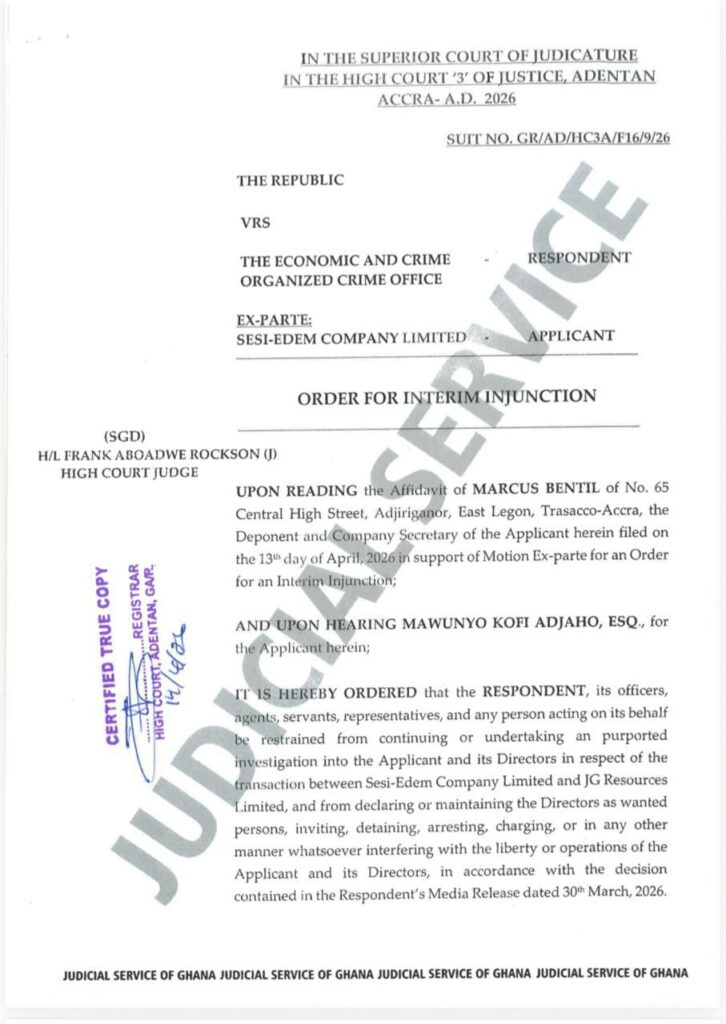 The court restrained EOCO, barring it and its officers from inviting, arresting, detaining, charging, or in any way interfering with the liberty of Dr Kwamigah-Atokple and the company’s directors.