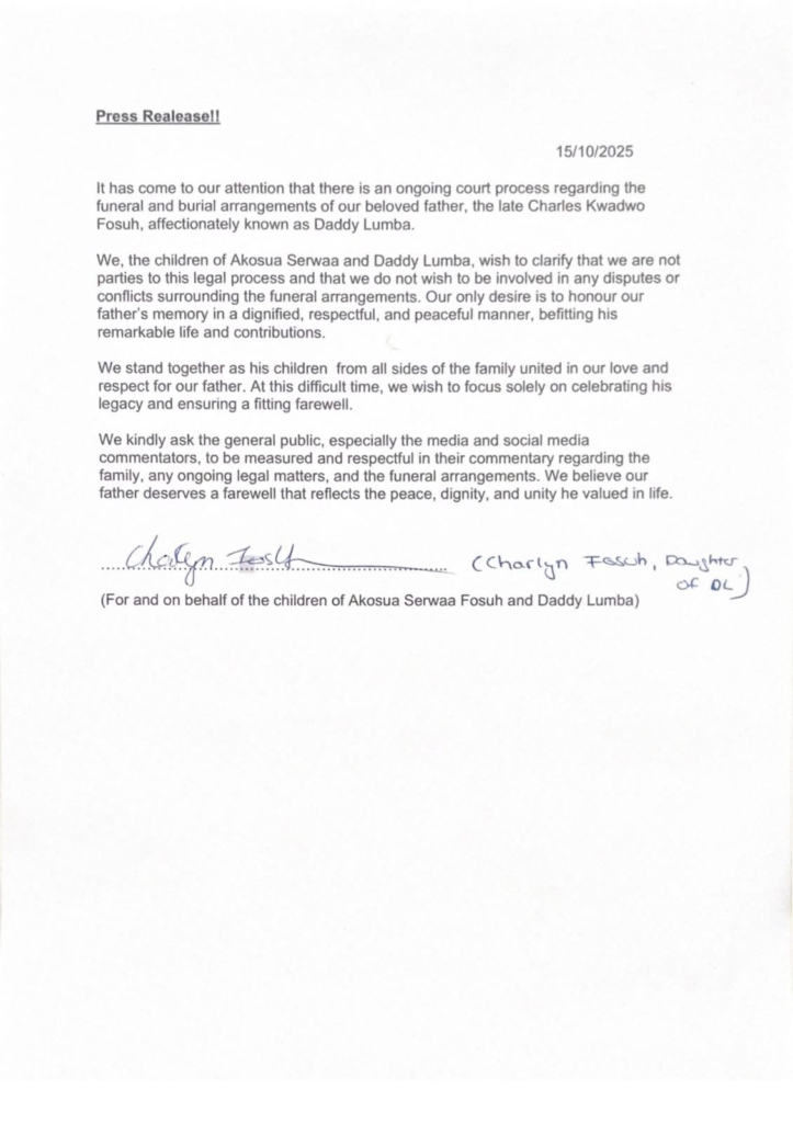 One of the children, Charlyn Fosuh, on behalf of the siblings with Akosua Serwaa Fosuh, in a statement, stated, “It has come to our attention that there is an ongoing court process regarding the funeral and burial arrangements of our beloved father, the late Charles Kwadwo Fosuh, affectionately known as Daddy Lumba”.