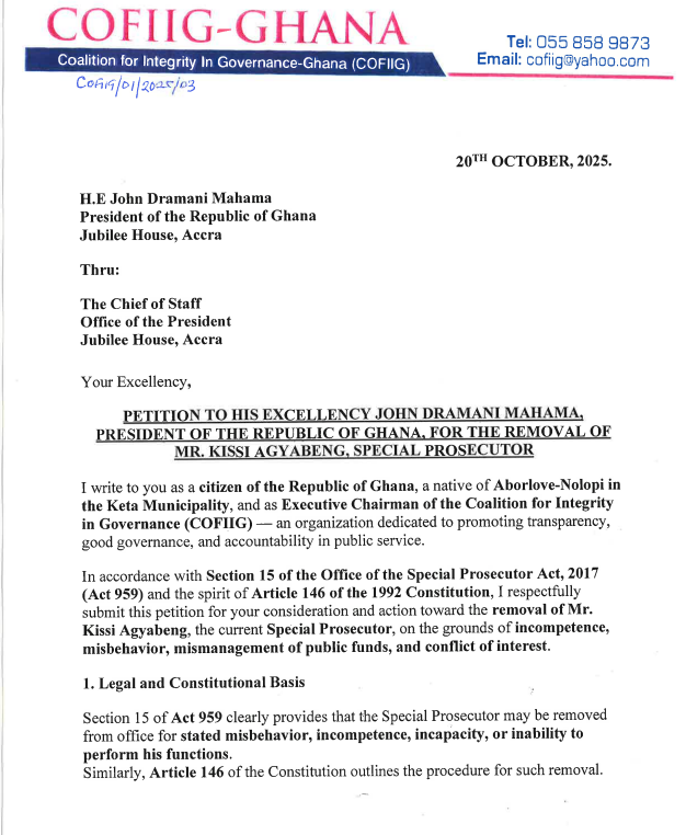 Executive Chairman of COFIIG, Simon Yaw Awadzi, called on President Mahama to initiate removal proceedings under Section 15 of the Office of the Special Prosecutor Act, 2017 and Article 146 of Ghana’s constitution.