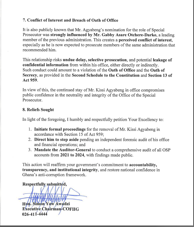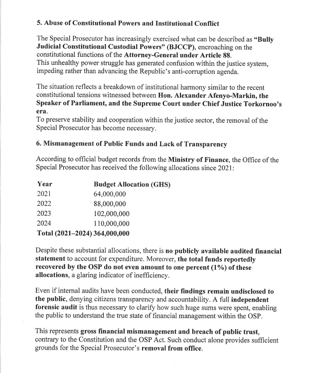 COFIIG petition further references alleged misbehaviour, noting claims that the Special Prosecutor withheld investigative dockets from the Attorney-General, delaying the extradition process of former finance minister Ken Ofori-Atta.