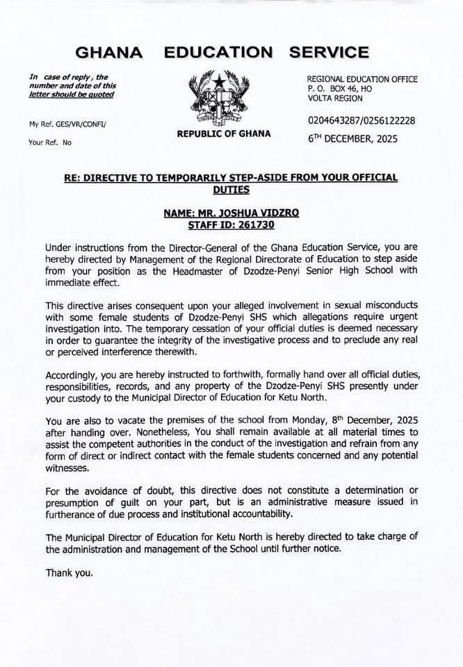 The headmaster of Dzodze Penyi Senior High School, Joshua Vidzro, has been ordered to step aside by the Ghana Education Service over allegations of sexual misconduct involving students.