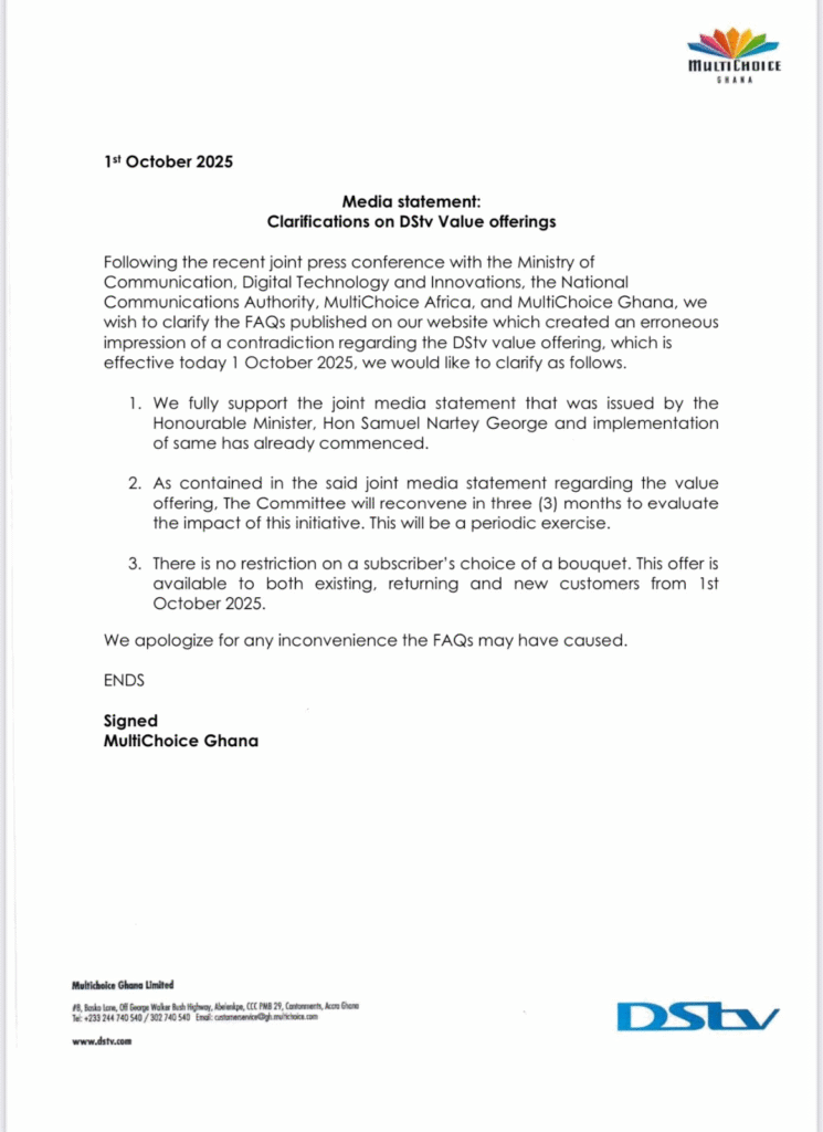 In a tement issued on Wednesday, October 1, 2025, reads, “Following the recent joint press conference with the Ministry of Communication, Digital Technology and Innovations, the National Communications Authority, MultiChoice Africa, and MultiChoice Ghana, we wish to clarify the FAQs published on our website, which created an erroneous impression of a contradiction regarding the DStv value offering, which is effective today, 1 October 2025. We would like to clarify as follows”.