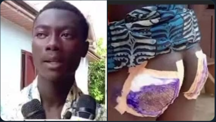 The viral post shared on X captured Kwame, the victime with treated sore buttocks after he was dragged through the rough streets.