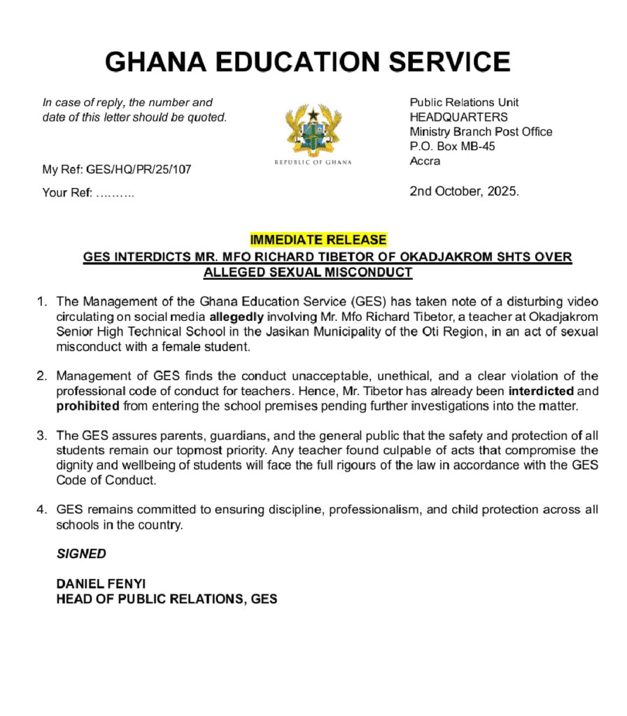 The GES remains committed to upholding the highest standards of professionalism, discipline, and child protection in all our schools. We strongly condemn any acts that compromise the safety, dignity, and well-being of students”, the GES statement added.
