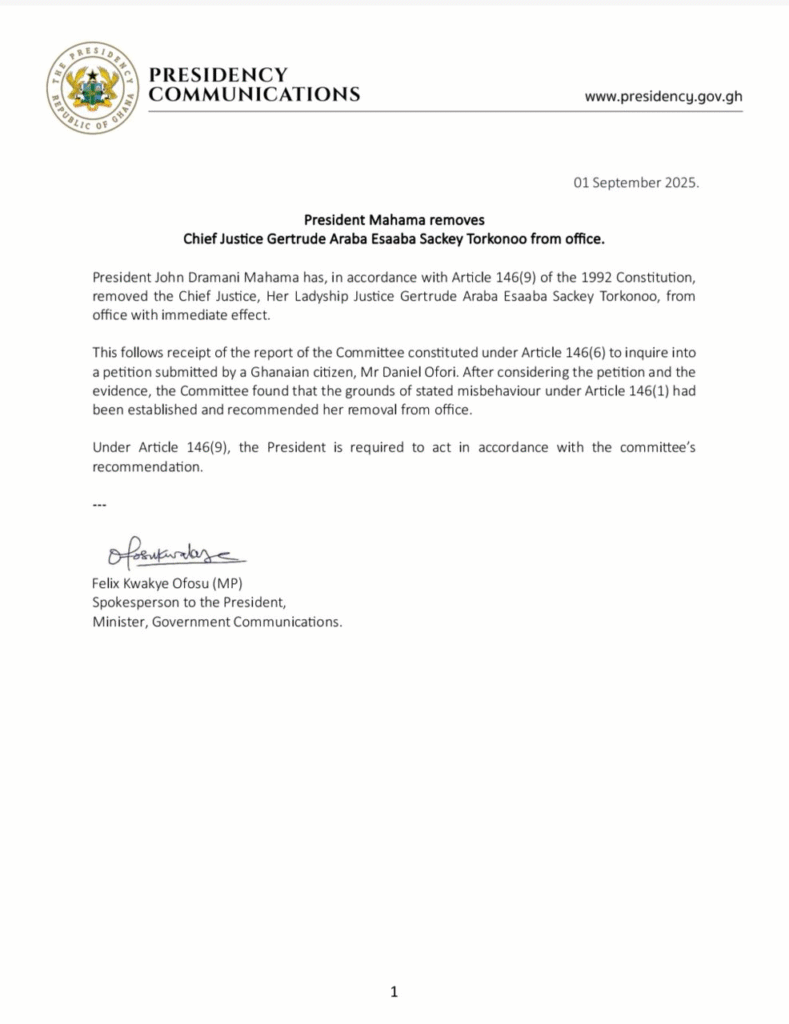 “President John Dramani Mahama has, in accordance with Article 146(9) of the 1992 Constitution, removed the Chief Justice, Her Ladyship Justice Gertrude Araba Esaaba Sackey Torkornoo, from office with immediate effect,” the statement said.
