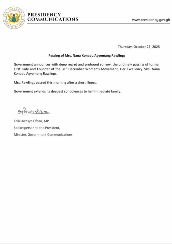 According to the statement, signed by Felix Kwakye Ofosu, MP, Spokesperson to the President and Minister of Government Communications, the former first lady died on Thursday, October 23, after a short illness.