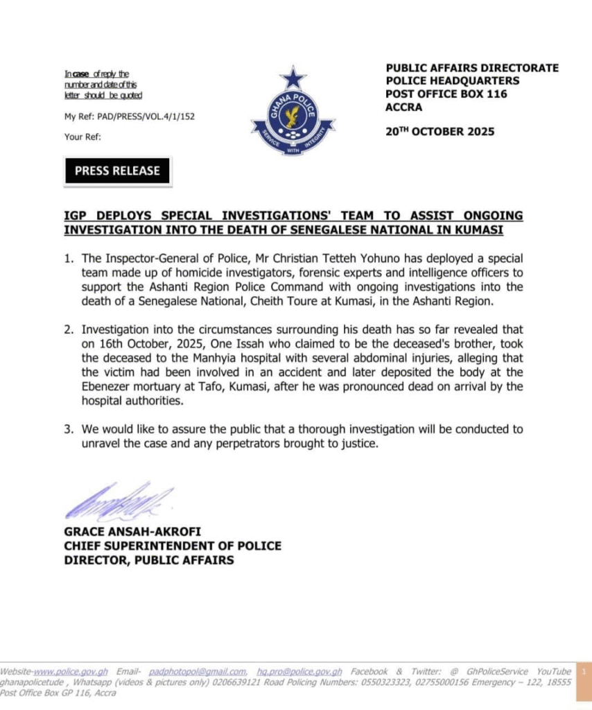A police statement signed by the Chief Superintendent of Police, Director, Public Affairs, Grace Ansah-Akrofi read, “The Inspector-General of Police, Mr Christian Tetteh Yohuno has deployed a special team made up of homicide investigators, forensic experts and intelligence officers to support the Ashanti Region Police Command with ongoing investigations into the death of a Senegalese National, Cheith Toure at Kumasi, in the Ashanti Region”.