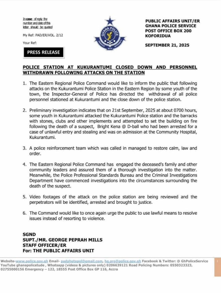 Preliminary investigation indicates that on 21st September, 2025 at about 0700 hours, some youth in Kukurantumi attacked the Kukurantumi Police station and the barracks with stones, clubs and other implements and attempted to set the building on fire following the death of a suspect, Bright Kena @ D-ball who had been arrested for a case of unlawful entry and stealing and was on admission at the Community Hospital, Kukurantumi”.