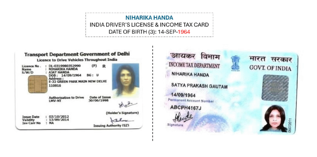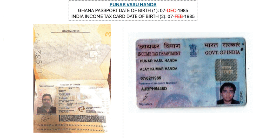 Also alarming is the fact that Niharika Handa’s son, Punar Vasu Handa, appears involved in similar identity fraud. His Ghanaian passport lists his date of birth as December 7, 1985, while his Indian PAN card records it as February 7, 1985. Before traveling from India to Dubai in 2015, he reportedly obtained a new passport declaring his date of birth as December 7, 1985, while claiming his old passport had been lost. Investigators are working with the assumption that the original passport reflected the date on his PAN card, and that he had the date of birth changed in the new passport with the intention to evade Indian immigration checks.