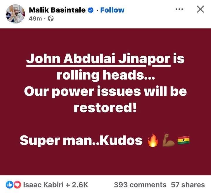 Malik Basintale, in a Facebook post, wrote, “John Abdulai Jinapor is rolling heads…Our power issues will be restored! Super man..Kudos”.