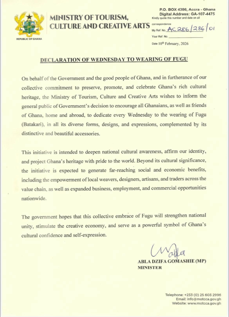 In a statement signed by the Minister for Tourism, Culture & Creative Arts, Abla Dzifa Gomashie, stated, “On behalf of the Government and the good people of Ghana, and in furtherance of our collective commitment to preserve, promote, and celebrate Ghana’s rich cultural heritage, the Ministry of Tourism, Culture and Creative Arts wishes to inform the general public of Government’s decision to encourage all Ghanaians, as well as friends of Ghana, home and abroad, to dedicate every Wednesday to the wearing of Fugu Batakari), in all its diverse forms, designs, and expressions, complemented by its distinctive and beautiful accessories,