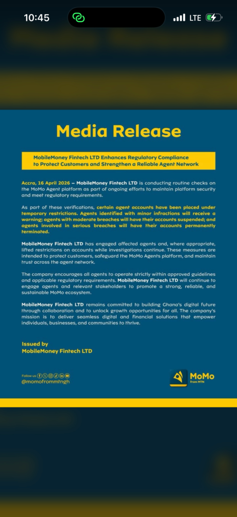 The Press release issued by Mobile Money Fintech Limited read, “MobileMoney Fintech LTD is conducting routine checks on the MoMo Agent platform as part of ongoing efforts to maintain platform security and meet regulatory requirements.