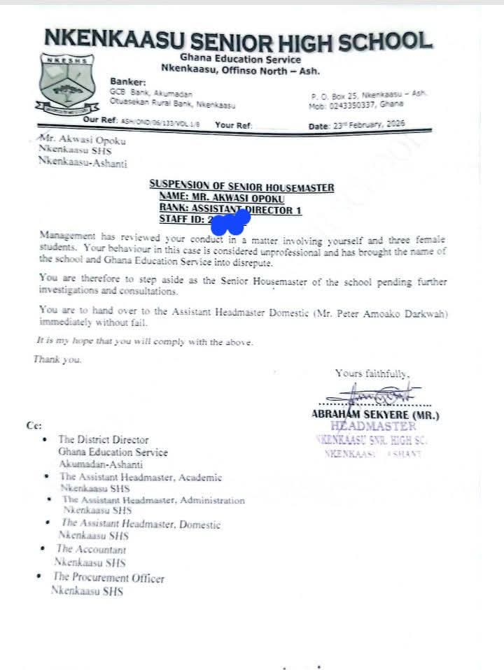 Akwasi Opoku, the Senior Housemaster of Nkenkaasu Senior High School, has been suspended following an alleged sexual misconduct with three female students.