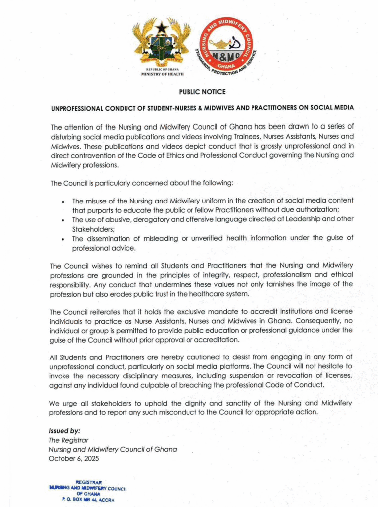 A statement dated October 6 and signed by the Registrar, Mrs Philomena Wooley, read, “The attention of the Nursing and Midwifery Council of Ghana has been drawn to a series of disturbing social media publications and videos involving Trainees, Nurses Assistants, Nurses and Midwives.
