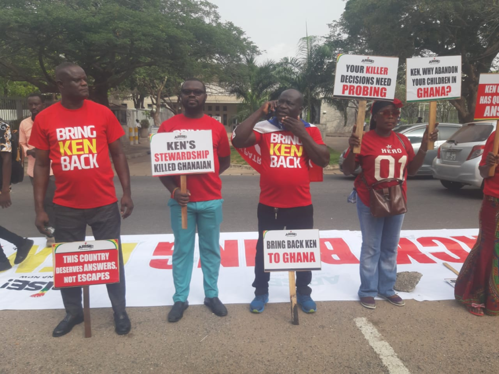 The group were with placards bearing inscriptions such as “Let Ofori-Atta Face Justice,” “Ken’s Leadership Killed Ghanaians”, “Ken Is Needed in Ghana, ‘Bring Ken Home”, and “No Hiding Place for Corruption.”