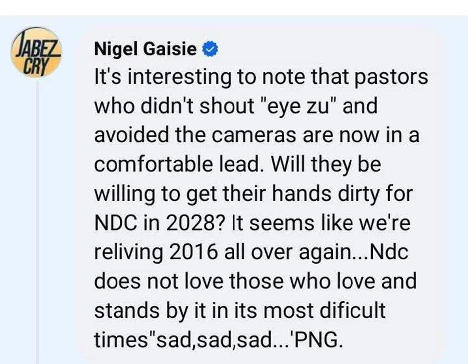 According to Nigel Gaisie, a pastor who did not shout 3y3 zu, he avoided the cameras are now comfortable enjoying questioning whether those pastors will be willing to get their hands dirty for NDC in 2028.