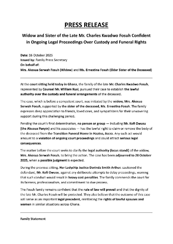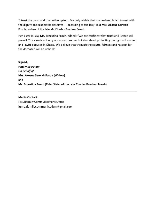 “The Fosuh family remains confident that the rule of law will prevail and that the dignity of the late Mr Charles Fosuh will be protected. They also believe that the outcome of this case will serve as an important legal precedent, reinforcing the rights of lawful spouses and women in similar situations across Ghana,” the statement added.