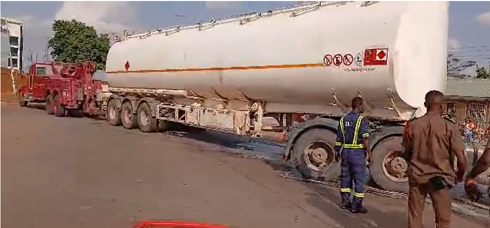 8. Firefighters remain at the scene to ensure safety as arrangements are underway for the safe transfer of the remaining petrol from the affected tanker into another tanker