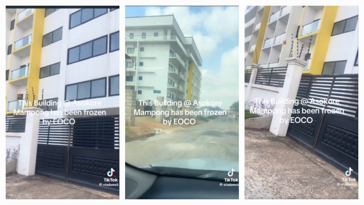 The man driving by the car stated, “Herh in Ghana, people have misappropriated funds. Look at this building around Asokore Mampong, it is not easy, it’s not a small house. EOOCO has seized it. It states the “Property frozen BY EOCO”.