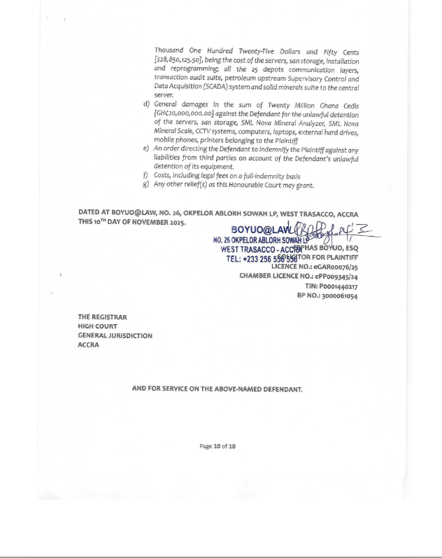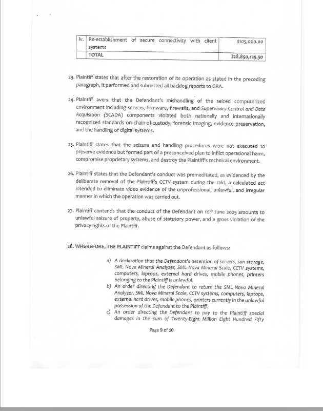 According to the claim filed at the High Court in Accra, SML is demanding the return of seized equipment and more than $28 million in damages.