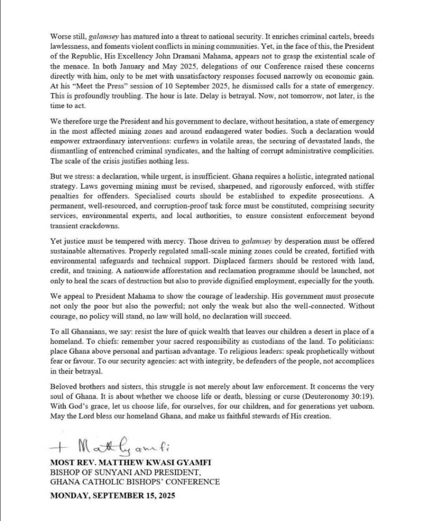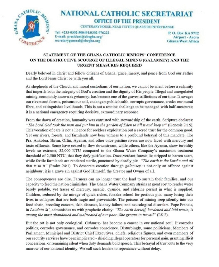 In a statement issued on Monday, September 15, 2025, the Bishops wrote, “Illegal and unregulated mining, commonly known as galamsey, has become one of the gravest afflictions of our time.