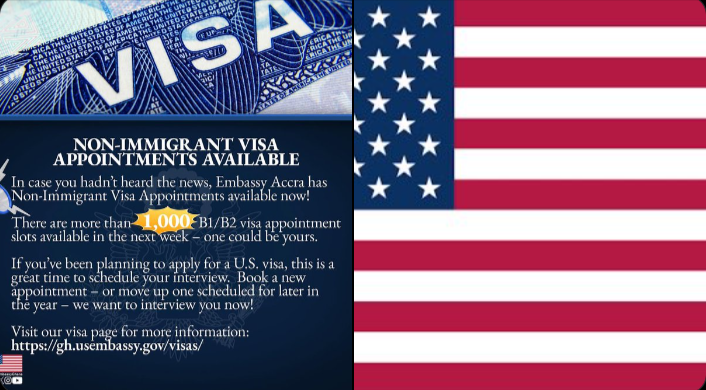 The U.S. Embassy in Ghana has announced the release of more than 1,000 appointment slots for Non-Immigrant (B1/B2) visa applicants in the coming weeks.