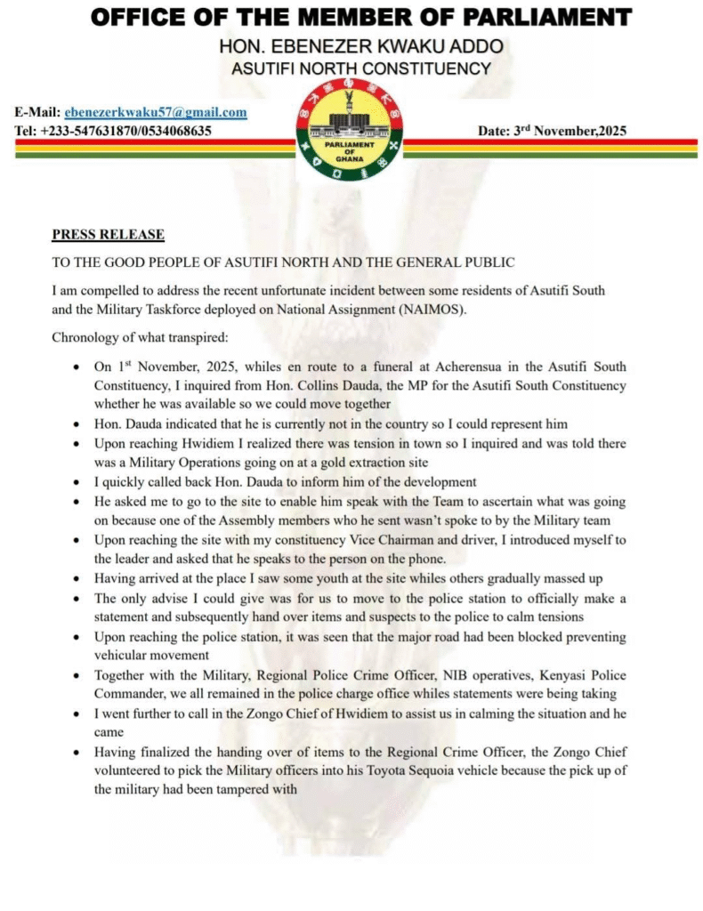 In a statement issued on November 3, 2025, Mr Addo narrated, “On 1st November 2025, while en route to a funeral at Acherensua in the Asutifi South Constituency, I inquired from Hon. Collins Dauda, the MP for the Asutifi South Constituency, whether he was available so we could move together.