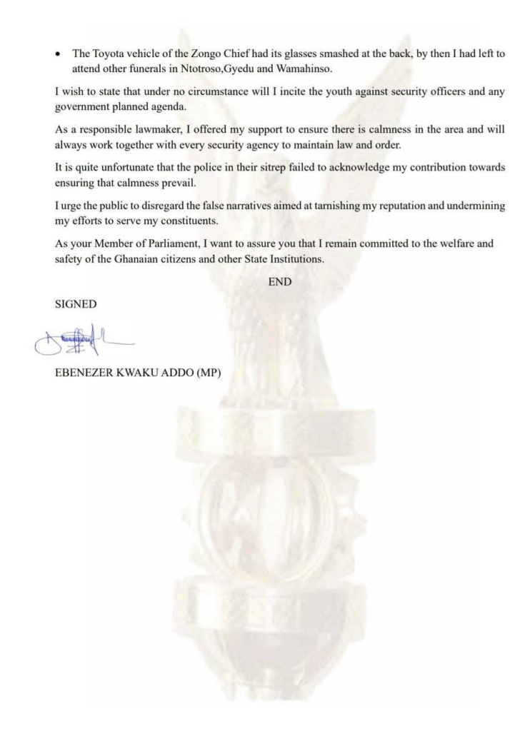 According to the Police statement, Ebenezer Kwaku Addo, the Member of Parliament for the Asutifi North Constituency, has been invited to assist with the probe.