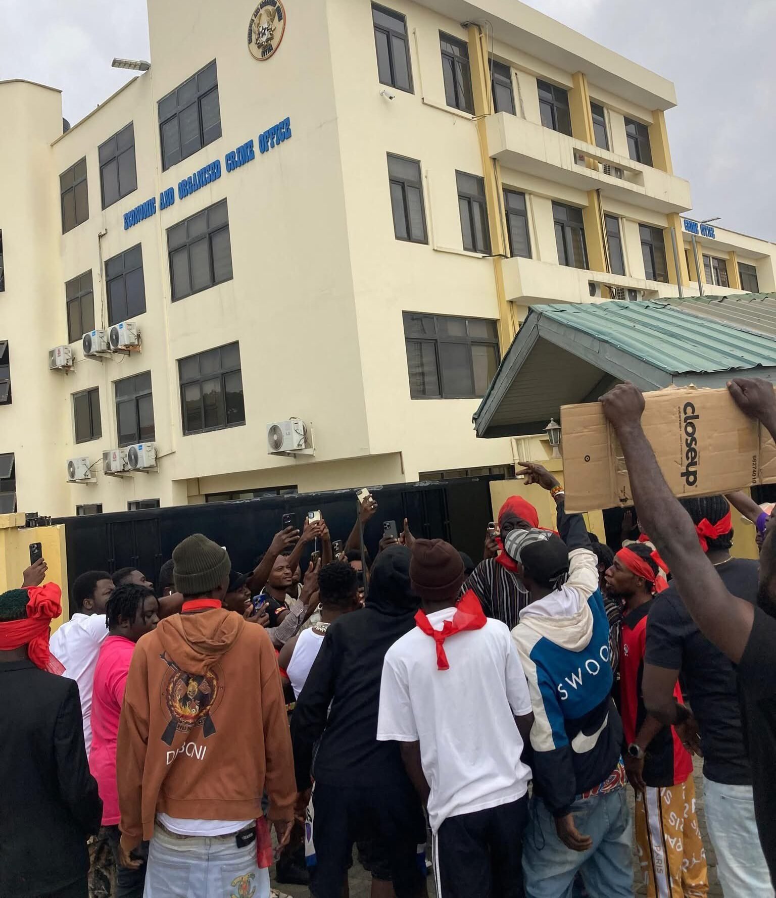 In a series of viral videos on social media, a large group of Shatta Wale fans stormed the EOCO office dressed in black and red bands.