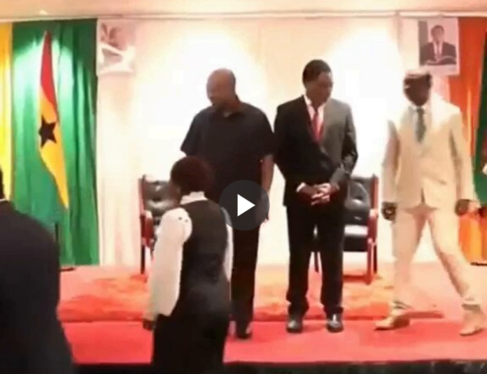 In the viral video, President Mahama and the Zambian President Hakainde Hichilema were standing on a stage when a lady attempted to climb, almost falling over, but was prevented from falling by John Mahama.