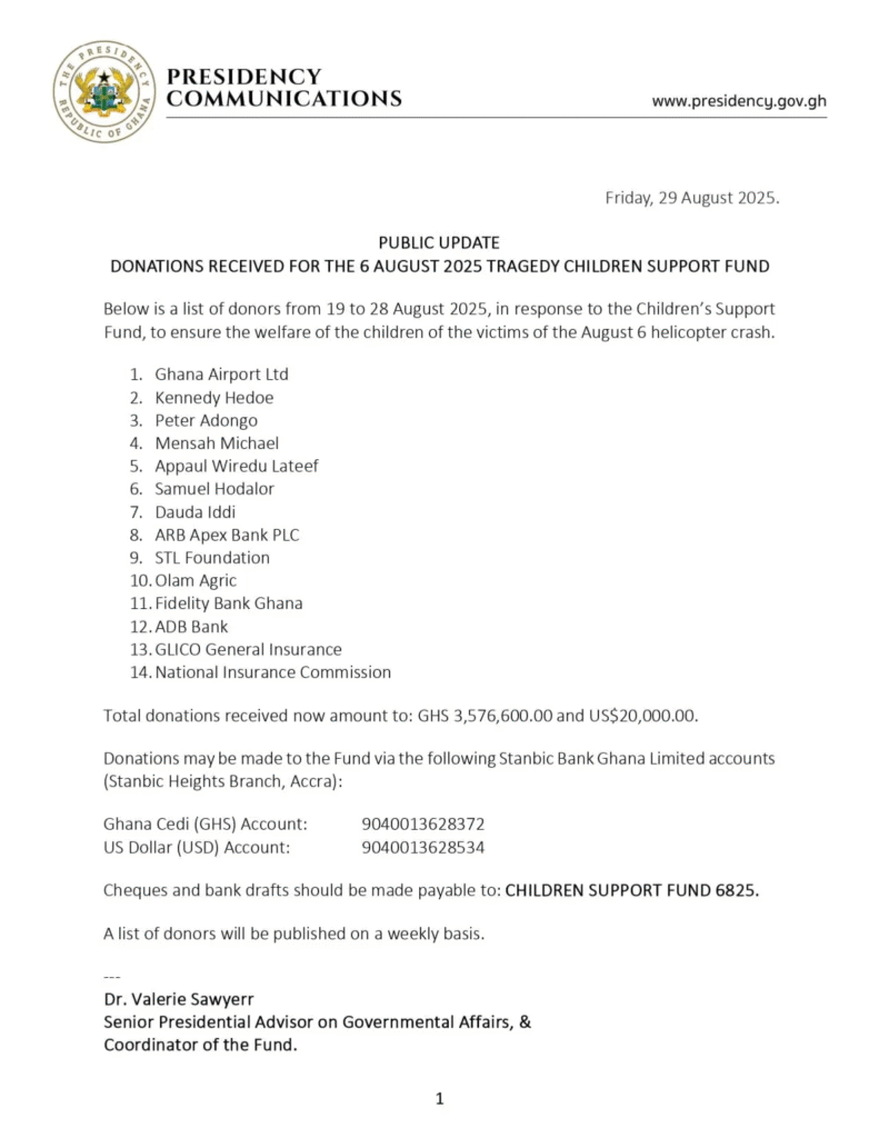Dr Valerie Sawyerr, Senior Presidential Advisor on Governmental Affairs and Coordinator of the Fund, has revealed that GH¢3,576,600 and $20,000 have been collected so far in the support fund children of victims of the August 6 helicopter crash.